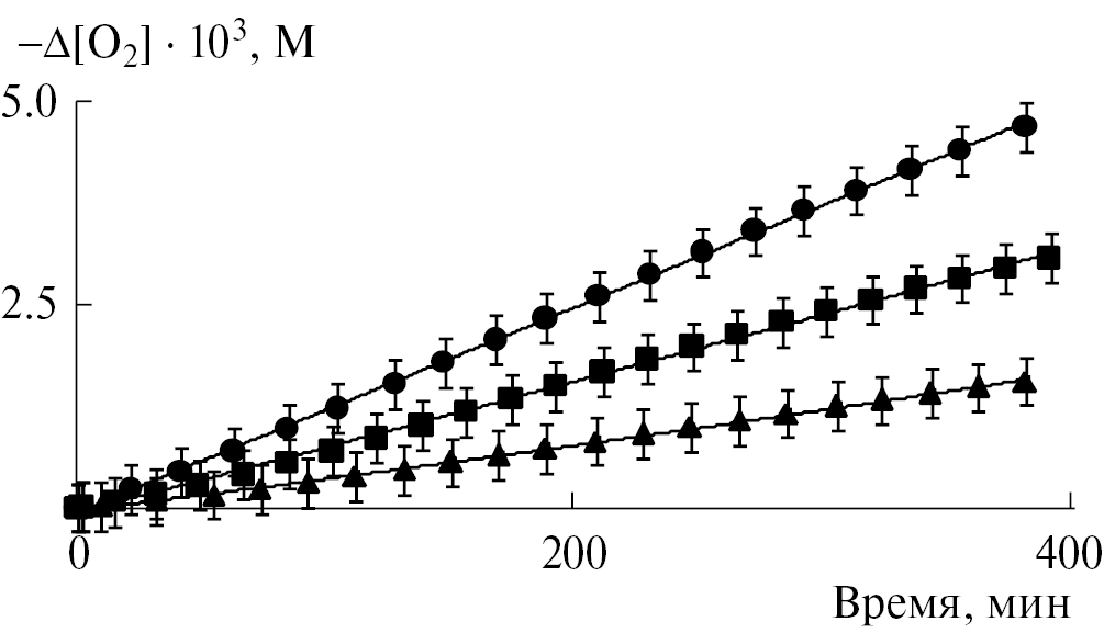 Эксперименты проводили при (310.0 ± 0.1) К в термостатированной ячейке объемом 3 мл в условиях энергичного перемешивания реакционной смеси. Скорость окисления (Wo2) измеряли по тангенсу угла наклона кинетических кривых уменьшения [O2] в исследуемом растворе. Все первичные экспериментальные данные обрабатывались по оптимизационной программе Kinetics 2012 версии 2.0 [26].