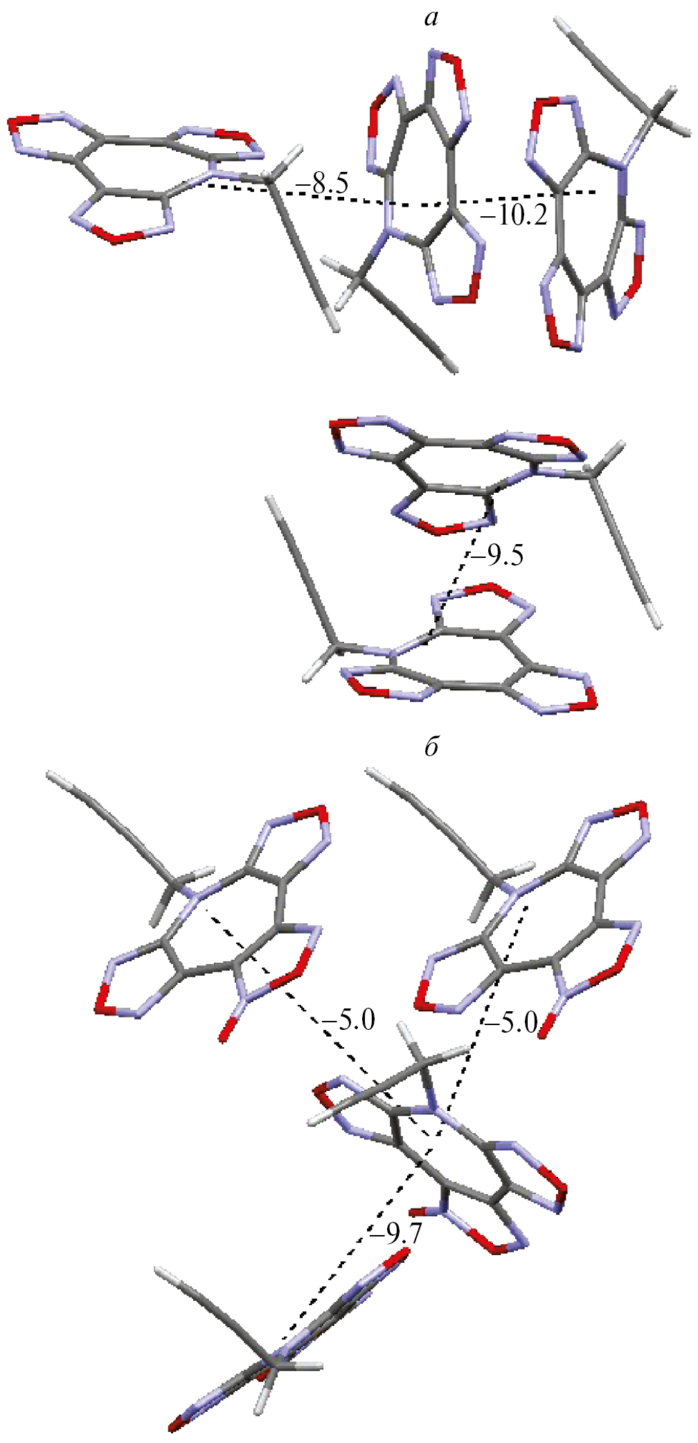Для рассматриваемых соединений выполнена оценка энергий кристаллической упаковки и межмолекулярных парных взаимодействий в отдельности [22, 23].Значения энергии кристаллических упаковок для соединений AzPrg и Az(O)Prg близки и составляют –153.6 и –136.8 кДж/моль соответственно. Основной вклад в энергию кристаллических упаковок обоих соединений, в основном, вносят межмолекулярные невалентные взаимодействия между неподеленными парами атомов азота и кислорода с π-системами соседних молекул (рис. 6).