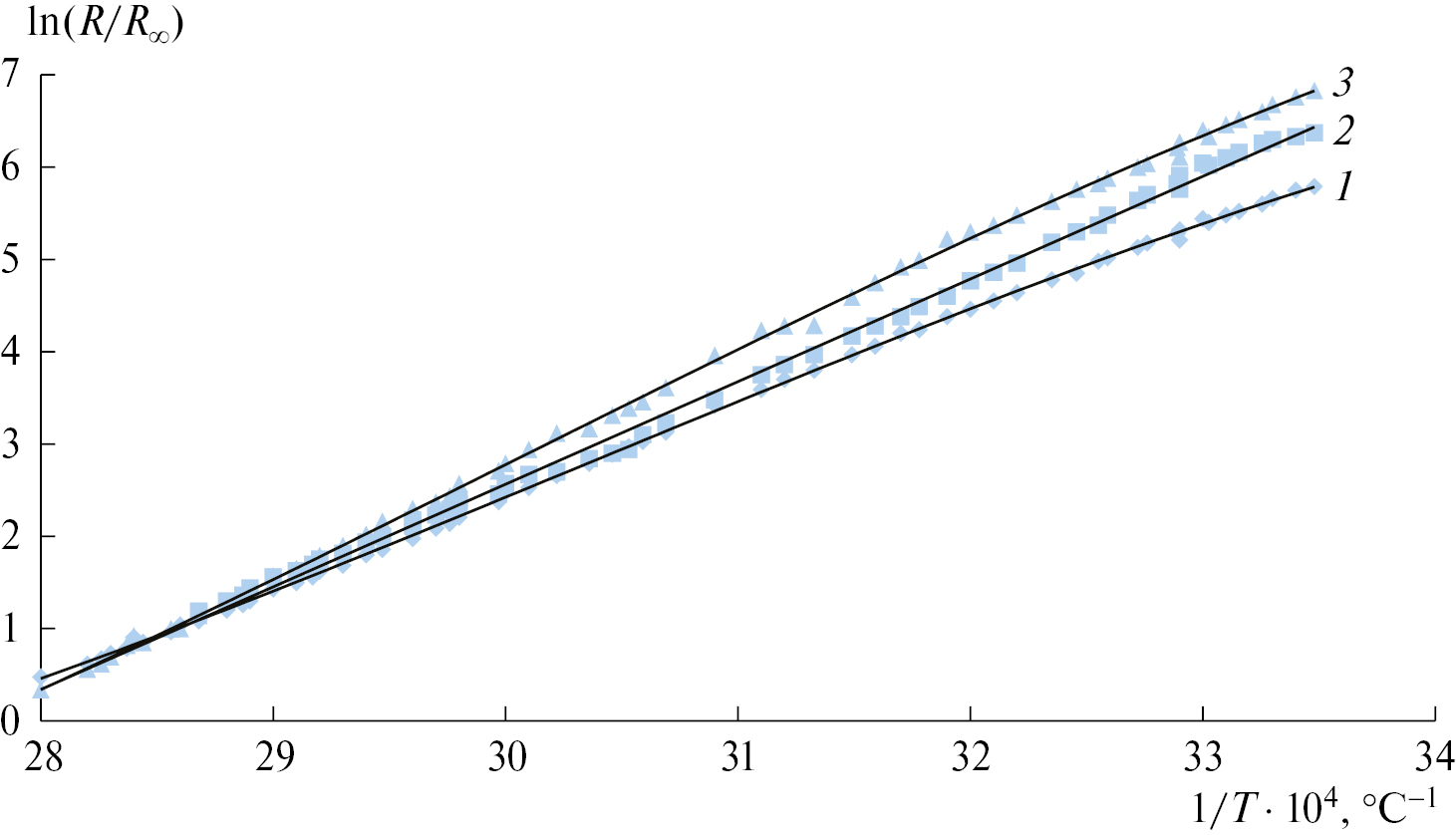 Полученные зависимости на рис. 2 аппроксимируются прямыми линиями в координатах ln (R/R∞) — 1/T (метод линейной аппроксимации). Результаты обработки соответс твующих зависимостей позволяют определить энергии активации уменьшения относительного удельного сопротивления сформированных пленок БНКС.