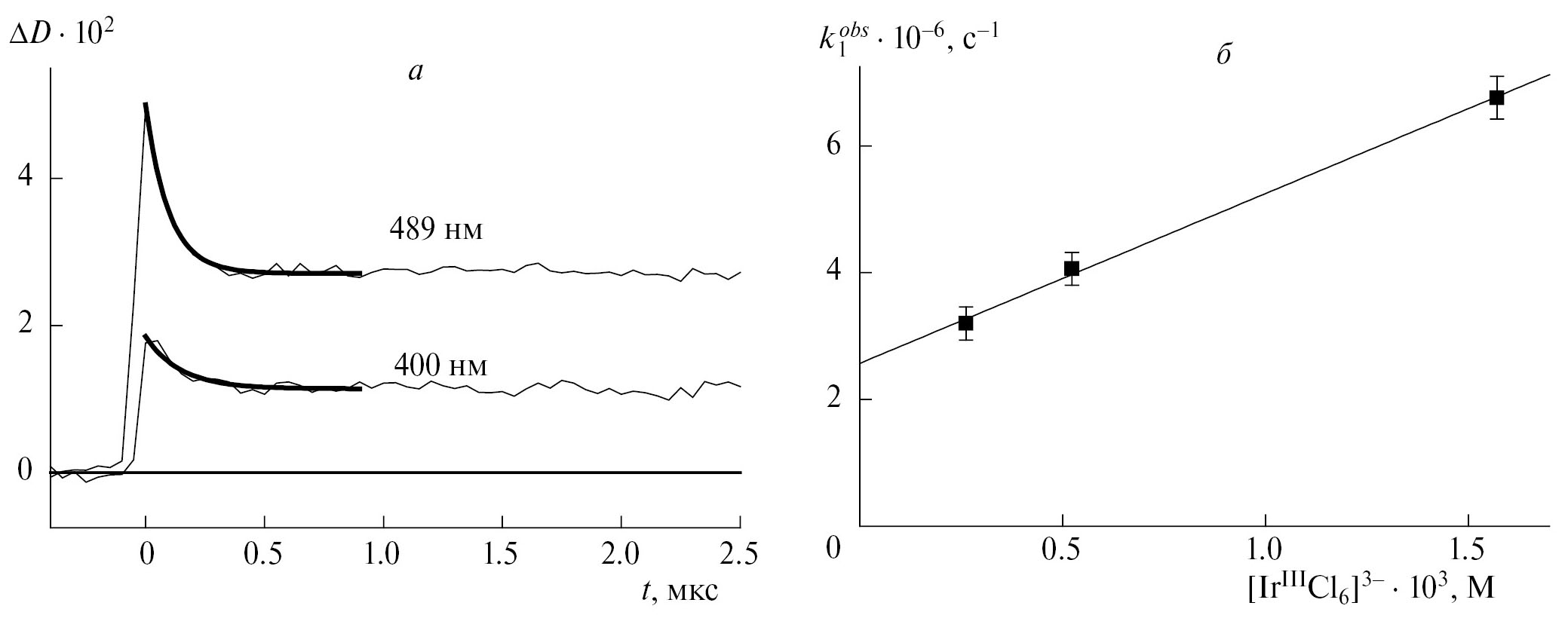Для определения константы скорости реакции (10) начальные участки кинетических кривых, соответствующие гибели акватированного электрона, аппроксимировали экспоненциальной функцией (примеры приведены на рис. 3a). Наблюдаемая константа скорости первого порядка линейно зависит от концентрации комплекса [IrIIICl6]3– (рис. 3б). По тангенсу угла наклона прямой рис. 3б получили значение константы скорости реакции (10): k10 = (2.7 ± 0.2) ‧ 109 M–1 ‧ c–1 (отсечение прямой соответствует каналам гибели eaq– , не связанным с исходным комплексом).