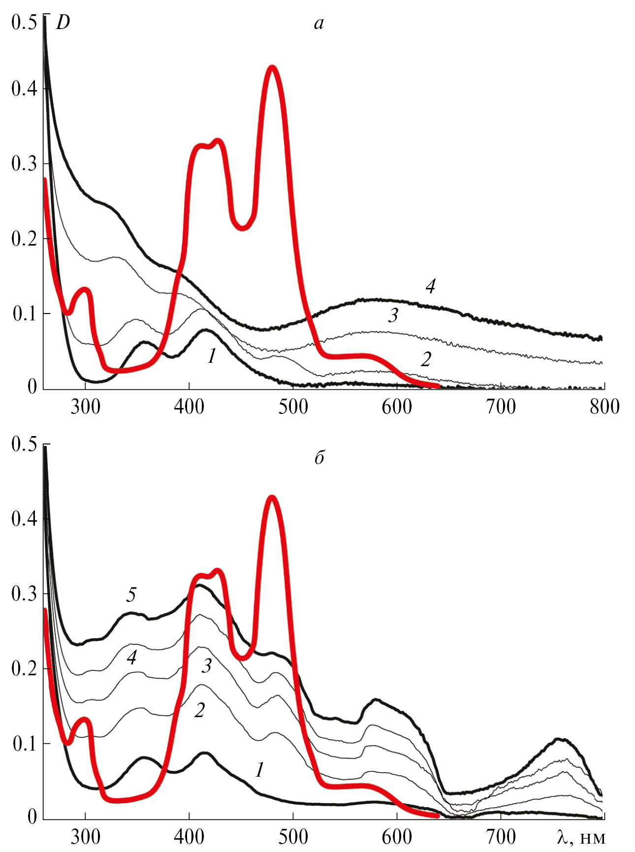 Рис. 5. Изменения ЭСП в ходе стационарного фотолиза (254 нм) комплекса [IrIIICl6]3– в водном растворе, концентрация — 1.1 · 10–3 M, кювета l = 1 см: a — раствор, продутый аргоном, кривые 1 — 4 соответствуют 0, 15, 90, 180 мин облучения; б — воздушно-насыщенный раствор, кривые 1–5 соответствуют времени облучения 0, 11, 21, 31, 41 мин. Спектр комплекса [IrIVCl6]2– представлен на обеих панелях жирными (красными) кривыми, соответствующими окислению 10% исходного комплекса.