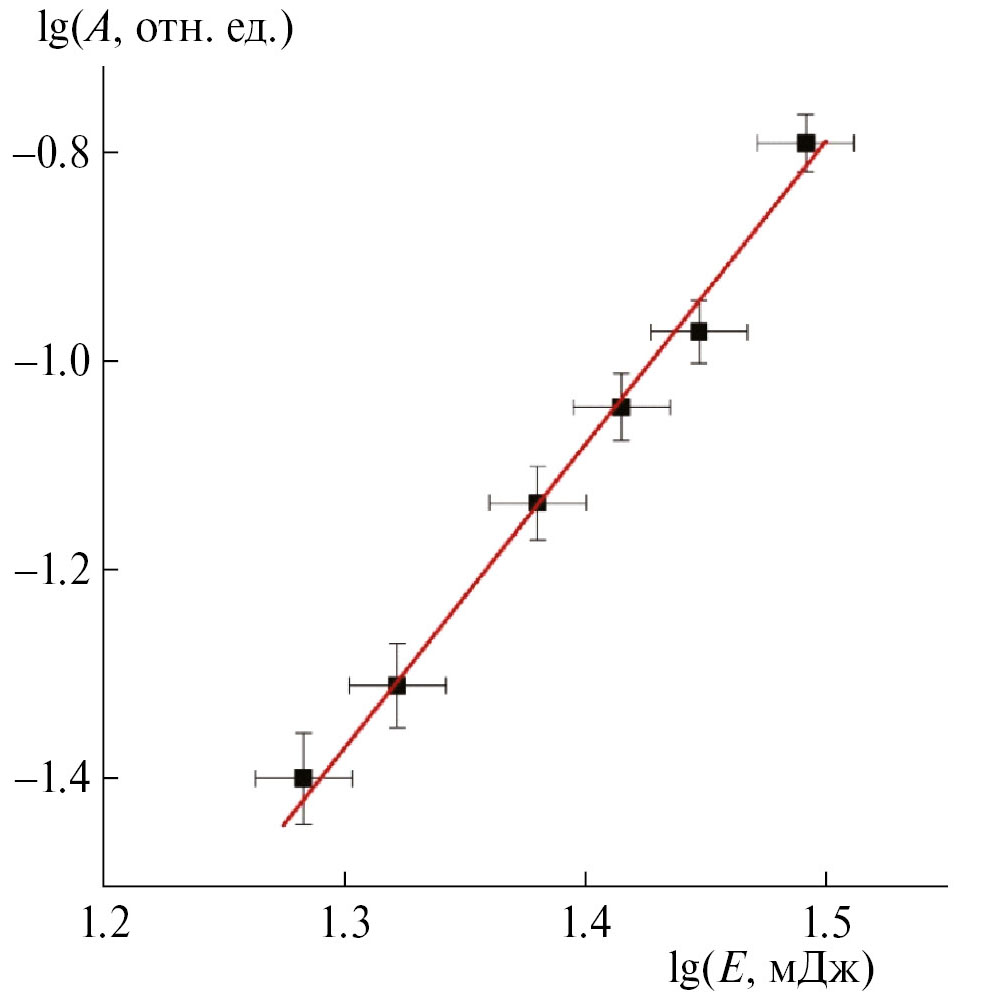 Рис. 4. Зависимость интеграла сигнала люминесценции А, зарегистрированного на длине волны 1300 нм при фотовозбуждении суспензии препарата “Арговит”, от энергии возбуждающего излучения в двойных логарифмических координатах.
