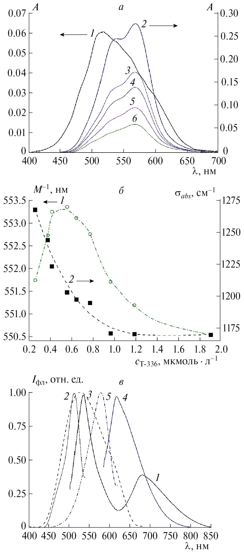 Рис. 2. а – Спектры поглощения красителей T-304 (кривая 1; cT-304 = 1 ‧ 10–6 моль ‧ л–1) и T-336, полученные при различных концентрациях красителя: cT-336 = = 1.92 ‧ 10–6 (кривая 2), 1.2 ‧ 10–6 (3), 9.72 ‧ 10–7 (4), 6.47 ‧ 10–7 (5) и 4.18 ‧ 10–7 моль ‧ л–1 (6) в буферном растворе HEPES; б – зависимости М–1 (1) и óabs от концентрации T-336 в буферном растворе; в – спектры флуоресценции (1 – Т-304, λex = 490 нм и 4 – Т-336, λex = 550 нм) и возбуждения флуоресценции (2 – Т-304, λreg = 550 нм; 3 – Т-304, λreg = 700 нм; 5 – Т-336, λreg = 640 нм).