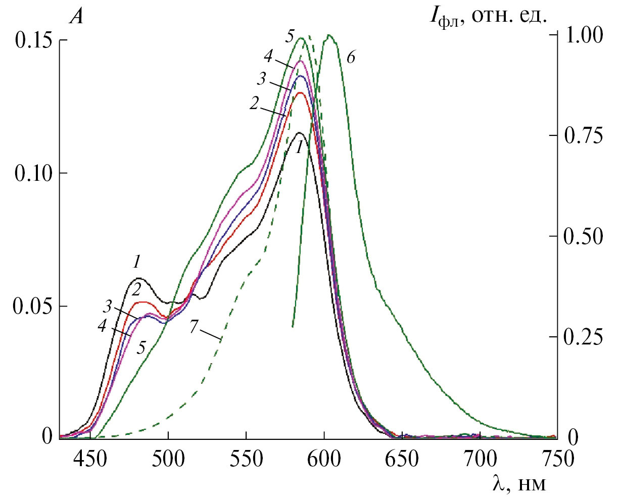 Рис. 4. Спектры поглощения (1–5), флуоресценции (6, λex = 570 нм) и возбуждения флуоресценции (7, λreg = 620 нм) красителя Т-306 в буферном растворе HEPES в присутствии высокой концентрации Tween-20 (≥ 20 ККМ). Спектры поглощения 1–5 регистрировали через 0 (кривая 1), 2 (2), 4 (3), 6 (4), 16 мин (5) после приготовления образцов.