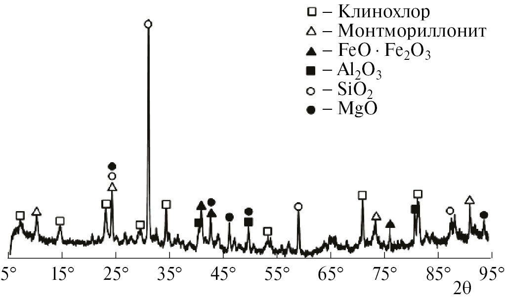 Согласно результатам рентгенофазового анализа, полиминеральная глина включала шесть кристаллических фаз, основная доля которых приходилась на железистый хлорит (48%), β-кварц (17%) и монтмориллонит (12%). Таким образом, общая доля филлосиликатов в глине составила 60%. Содержание остальных фаз (оксидов: MgO, Al2O3 и Fe3O4) не превышало 10%. На рис. 4 приведена дифрактограмма с идентифицированными рефлексами.