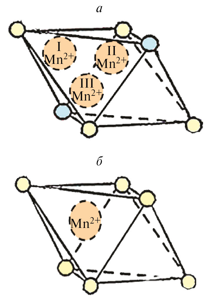 Совокупность полученных данных позволила представить возможное расположение неэквивалентных ионов Mn2+ внутри кристаллической ячейки филлосиликатов вдоль трех типов вершин октаэдра, образованных атомами кислорода (рис. 7а). Первые два положения (I и II) соответствовали двум парам ионов Mn2+, взаимодействующих с атомами кислорода в вершинах октаэдра, равноудаленных от ОН-групп, и ионам Mn2+, взаимодействующим с протоном гидроксильной ОН-группы (тип III) [34].