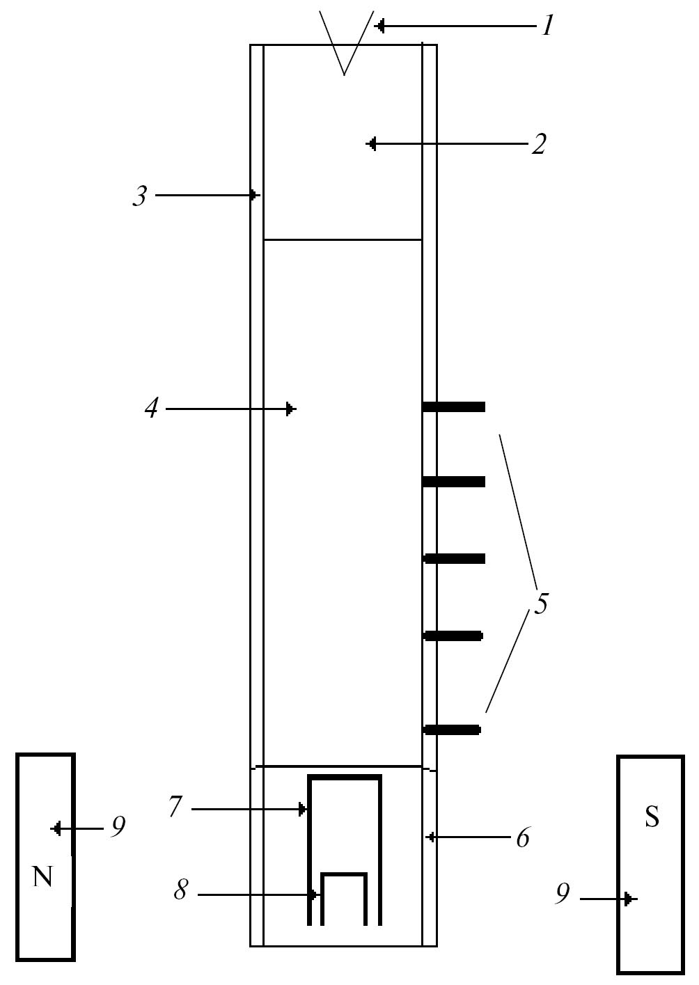 Рис. 1. Схема электромагнитной методики измерения массовой скорости при детонации конденсированных ВВ: 1 – капсюль-детонатор, 2 – промежуточный детонатор, 3 – трубка, 4 – исследуемый образец ВВ, 5 – электро-контактные датчики для измерения скорости детонации, 6 – секция c электромагнитными датчиками, 7 – первый датчик для измерения массовой скорости, 8 – второй датчик для контроля скорости детонации, 9 – полюса электромагнита.