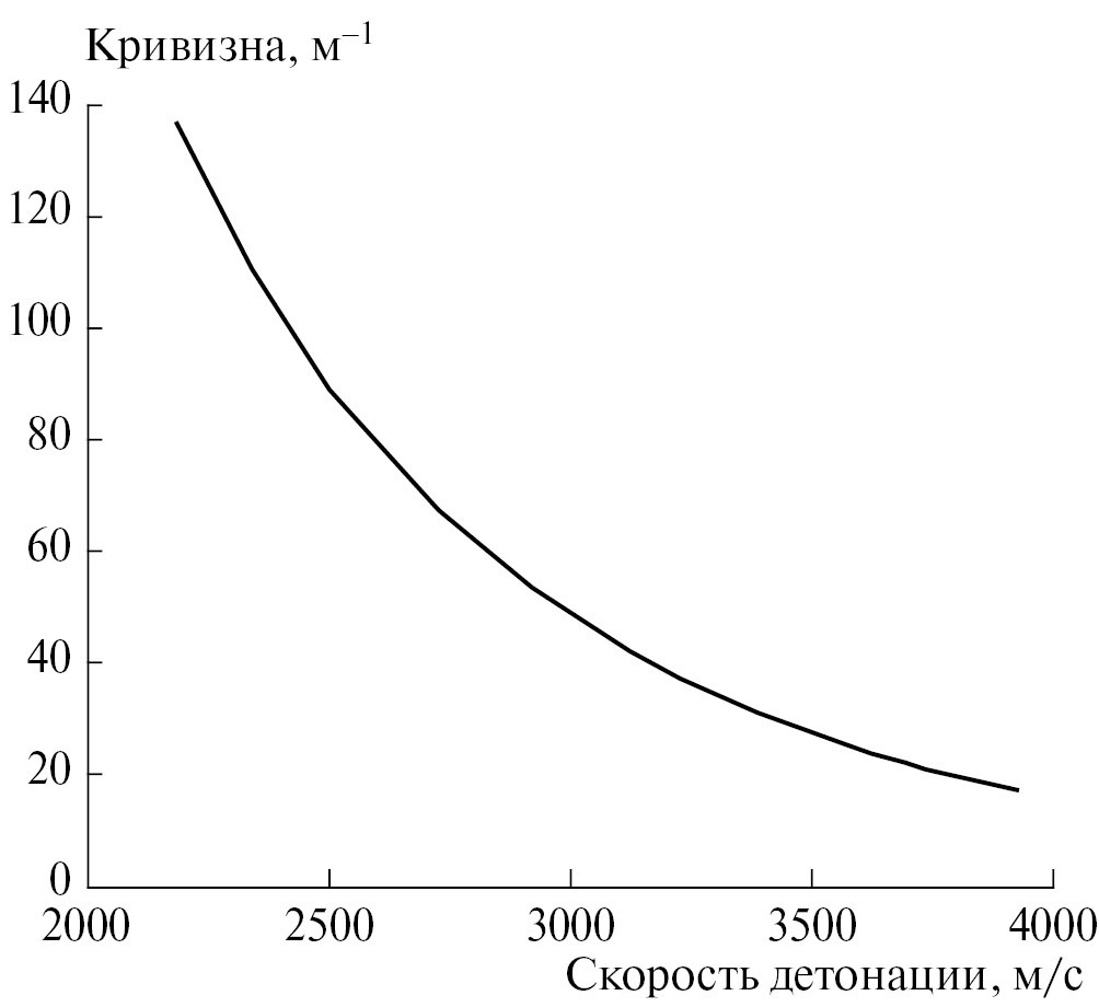 Рис. 4. Зависимость кривизны фронта от скорости детонации. Расчет для смеси 17% НМ + Al/ПХА (1 : 1) при плотности 1.1 г/см3.