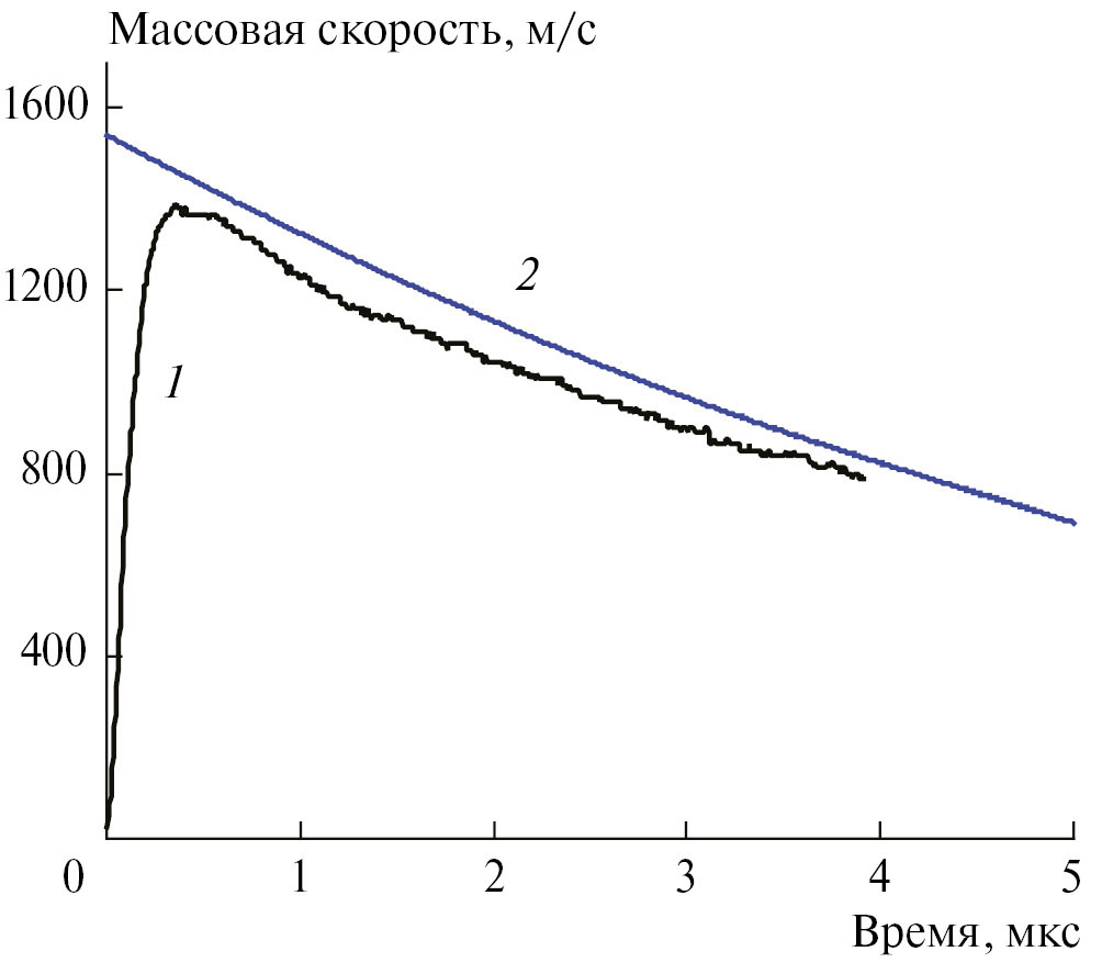 Видно, что рассчитанный профиль, как и его экспериментальный аналог, имеет слабую вогнутость. Средний спад массовой скорости равен 160 м/с за 1 мкс, а расхождение между профилями не выходит за пределы погрешности измерений. Рассчитанное значение массовой скорости на ударном фронте волны равно 1540 м/с; давление на фронте составляет около 5 ГПа. Полное время вдоль зоны реакции от ударного фронта до поверхности Чепмена–Жуге, полученное в расчете, равно ≈ 5 мкс. Таким образом, расчеты позволяют сделать вывод, что измеренный профиль массовой скорости целиком приходится на зону реакции детонационной волны.