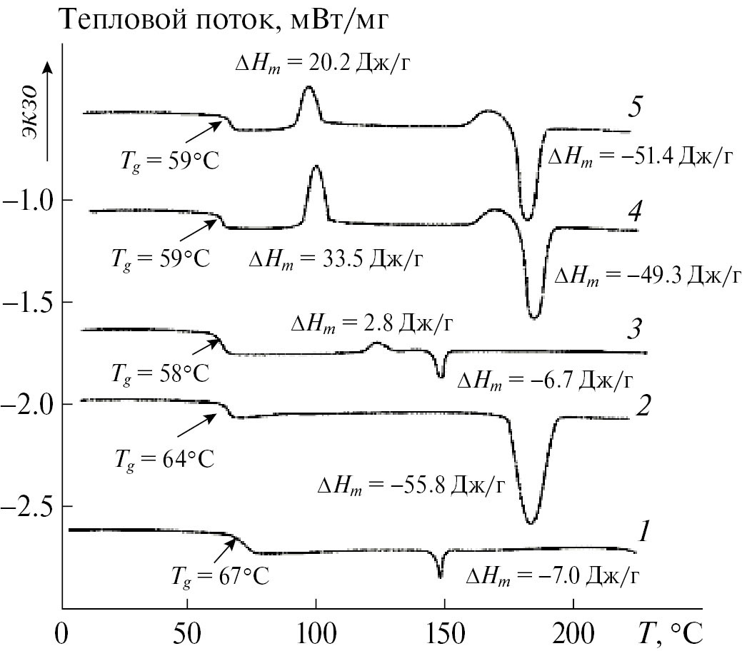 Рис. 1. Термограммы образцов ПЛА-1 (1, 3) и ПЛА-2 (2, 4, 5). Кривые 1, 2 относятся к исходным образцам, кривые 3–5 – к образцам, полученным при температурах в зоне пластикации/прессования 190°С/190°С и давлении в прессе 10 000 кгс. Скорость охлаждения температуры в прессе составляла 60 (3, 4) и 15°С/мин (5).
