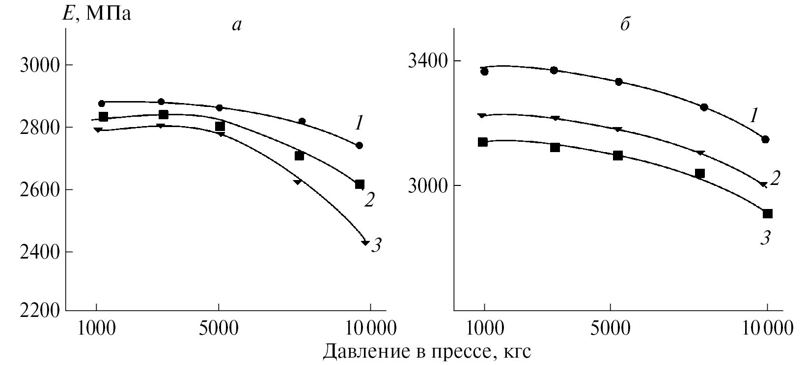 Рис. 2. Зависимость модуля упругости образцов ПЛА-1 (а) и ПЛА-2 (б) от величины давления в прессе для образцов, полученных со скоростью охлаждения после прессования 10 (1), 15 (2) и 60°С/мин (3).