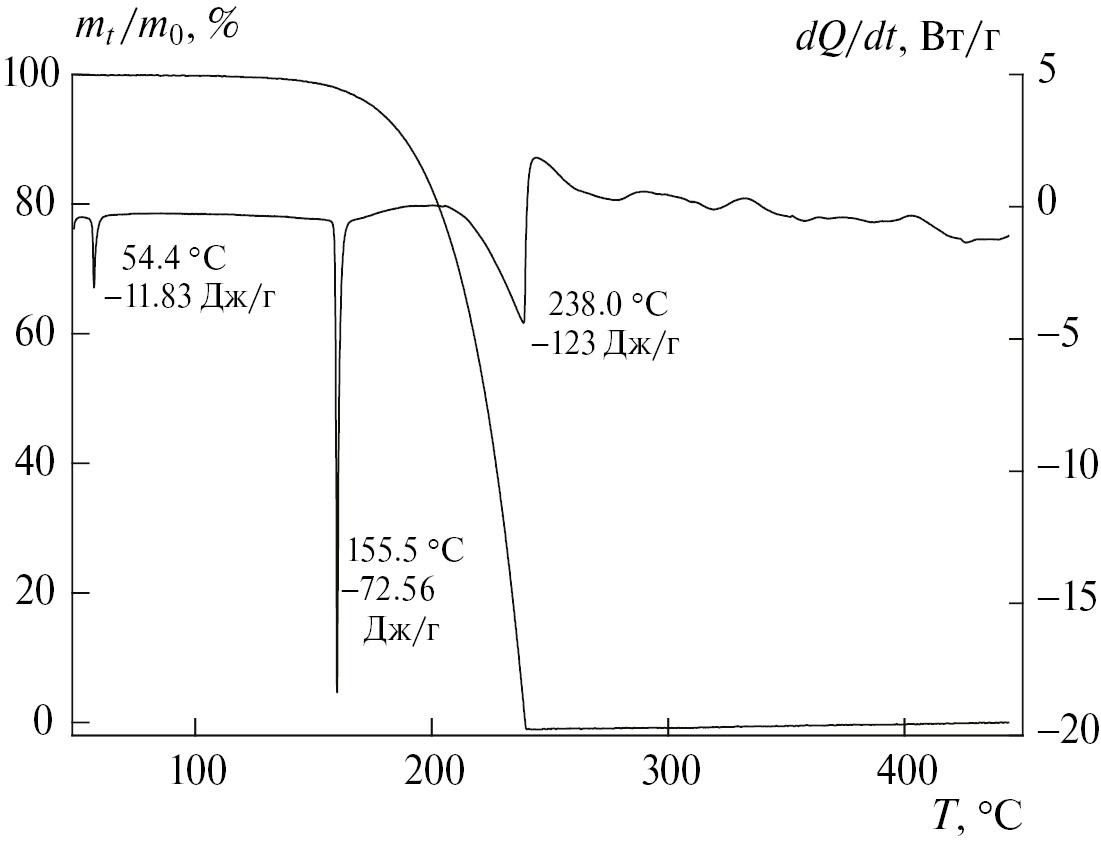 На рис. 2 представлены результаты по кинетике реакции термического разложения AzCH3, полученные методом термогравиметрии (ТГ) и дифференциально-сканирующей калориметрии (ДСК). На кривой ДСК при разложении образца AzCH3 наблюдаются три эндотермических пика. До плавления наблюдается полиморфный переход при температуре 54.4 °C с теплотой, равной –11.83 Дж/г. Второй эндотермический пик при температуре 155.5 °С связан с плавлением, теплота процесса составляет –72.56 Дж/г. Далее с ростом температуры наблюдается только начало экзотермического разложения, параллельно с которым происходит испарение образца, и наблюдается третий эндотермический пик при температуре 238 °С, соответствующий полному испарению образца с суммарным эндотермическим эффектом, равный –123 Дж/г.