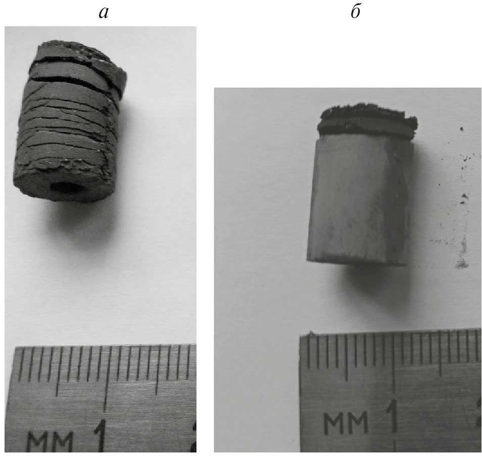 Образец из исходной смеси Ni + Al сгорел полностью. При этом скорость горения составила 0.5 см/с, максимальная температура горения – 1500 °С, относительное удлинение образца продуктов – 7%. Образцы из исходной смеси горят в нестационарном режиме, когда стадия депрессии сменяется быстрым сгоранием прогретого слоя вещества, образовавшегося на стадии депрессии. При сгорании прогретого слоя температура горения превышает адиабатическую температуру горения [23]. При внимательном рассмотрении внешнего вида сгоревшего образца из исходной смеси Ni + Al, видно, что он состоит из чередующихся слоев продукта, разделенных поперечными трещинами, которые образовались в момент вспышки за счет выхода примесных газов (рис. 3а). При добавлении в исходную смесь 10 мас. % кобальта образец не догорал до конца, сгорал лишь небольшой его фрагмент, после чего горение прекращалось. Фотографии образцов продуктов горения исходной смеси Ni + Al и частично сгоревшего образца из смеси Ni + Al + 10%Co представлены на рис. 3.