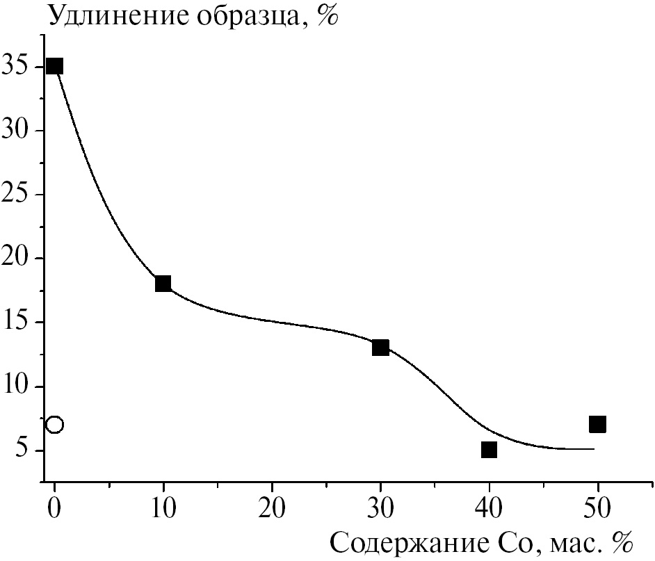 Рис. 5. Зависимость относительного удлинения сгоревшего образца от содержания кобальта из исходной (○) и активированной (■) смеси Ni + Al + xCo.