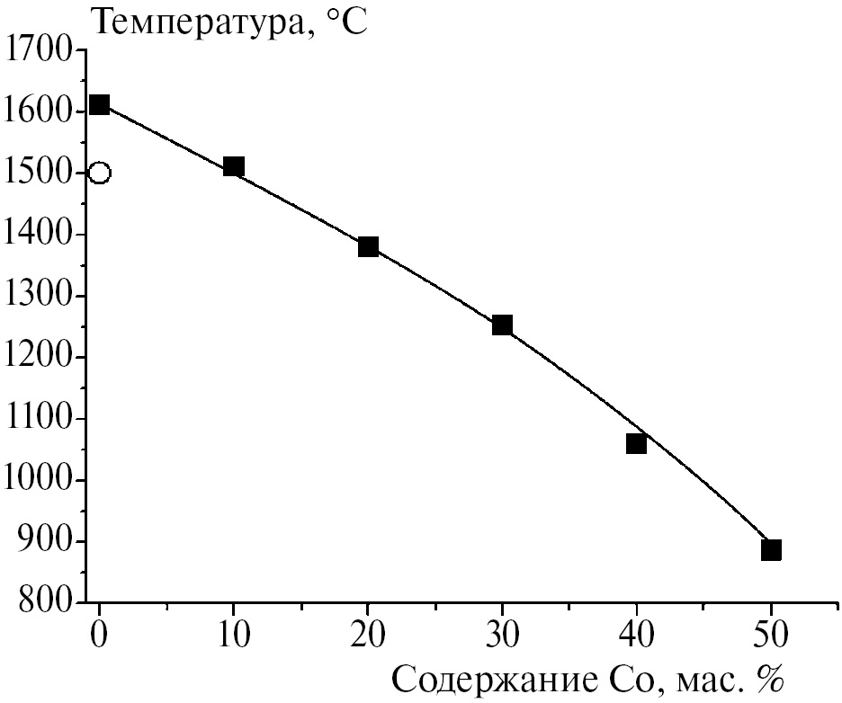 Зависимость скорости горения образцов из активированной смеси Ni + Al + xCo от содержания кобальта имеет максимум при х = 10 мас. % (рис. 4). Вероятно, при добавлении в смесь Ni + + Al 10 мас. % кобальта преобладающим над уменьшением теплового эффекта реакции фактором является сокращение количества выделяющихся при горении примесных газов. При возрастании содержания кобальта в смеси уменьшается температура горения (рис. 6) и, соответственно, количество выделяющихся при синтезе примесных газов. В соответствии с конвективно-кондуктивной моделью горения уменьшение давления примесных газов, выделяющихся перед фронтом горения, приводит к увеличению скорости горения [29]. Другим возможным обьяснением уменьшения скорости горения при увеличении количества примесных газов, выделяющихся перед фронтом горения, является уменьшение теплопроводности образца в зоне прогрева за счет разрыхляющего действия примесных газов [30].