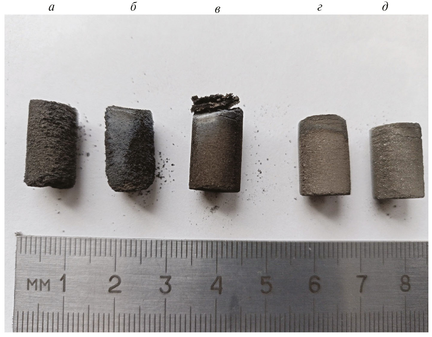 Рис. 8. Фотографии образцов продуктов горения активированных смесей Ni + Al + xCo при х = 10 (а), 20 (б), 30 (в), 40 (г), 50 мас. % (д).