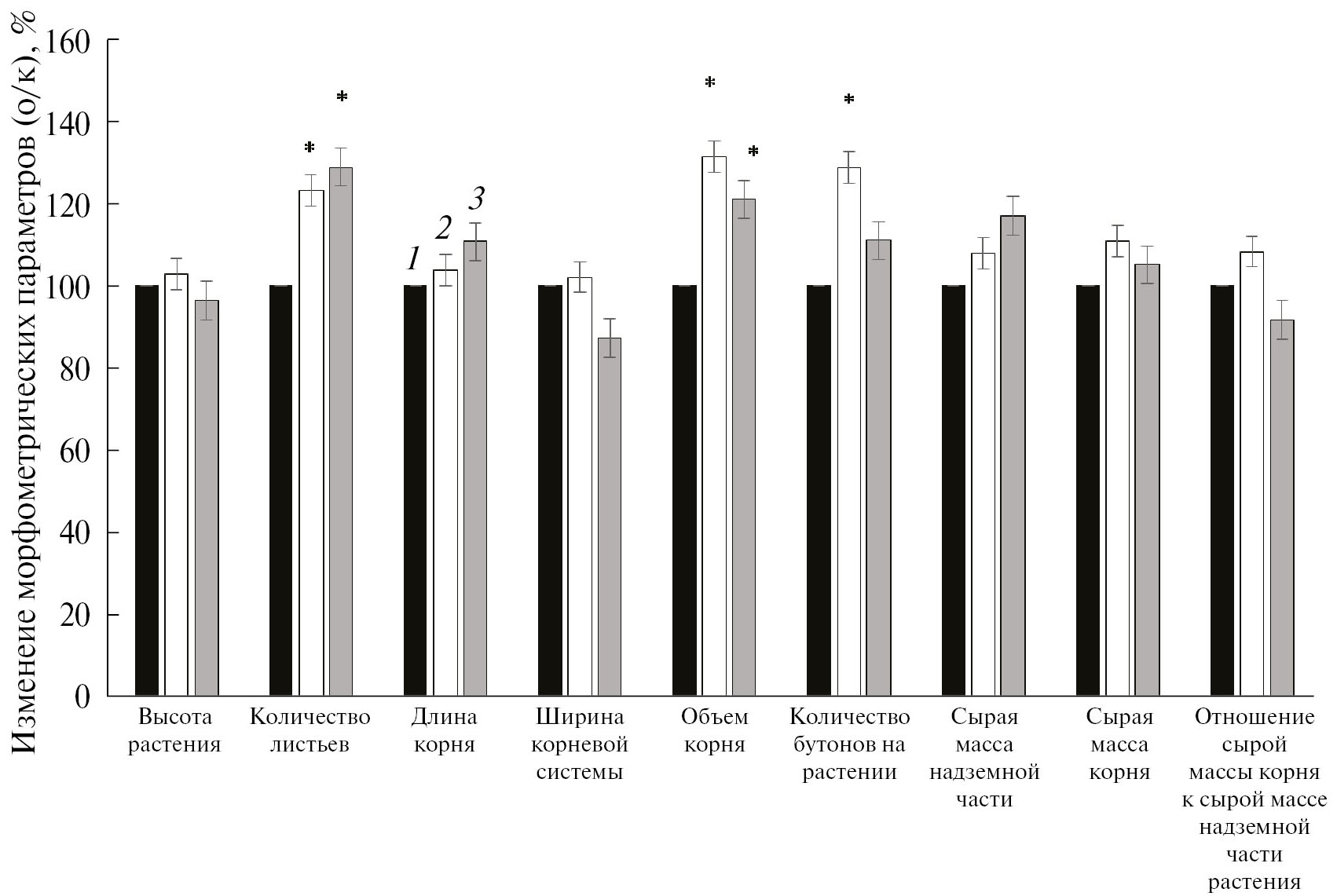 Рис. 3. Изменение морфометрических показателей растений перца, выращенных из семян, обработанных препаратом с наночастицами цинка: 1 – контроль (необработанные семена); 2 – предпосевная обработка семян НЧ цинка в концентрации 10–5%; 3 – предпосевная обработка семян НЧ цинка в концентрации 10–6%; * — достоверность изменений по критерию Стьюдента р ≤ 0.05.