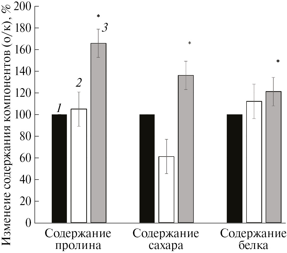 Рис. 5. Изменение содержание пролина, растворимых сахаров и белка в листьях растения перца после предпосевной обработки семян наночастицами цинка в составе полимеров: 1 – контроль (необработанные семена); 2 – предпосевная обработка семян НЧ цинка в концентрации 10–5%; 3 – предпосевная обработка семян НЧ цинка в концентрации 10–6%; * — достоверность изменений по критерию Стьюдента р ≤ 0.05.