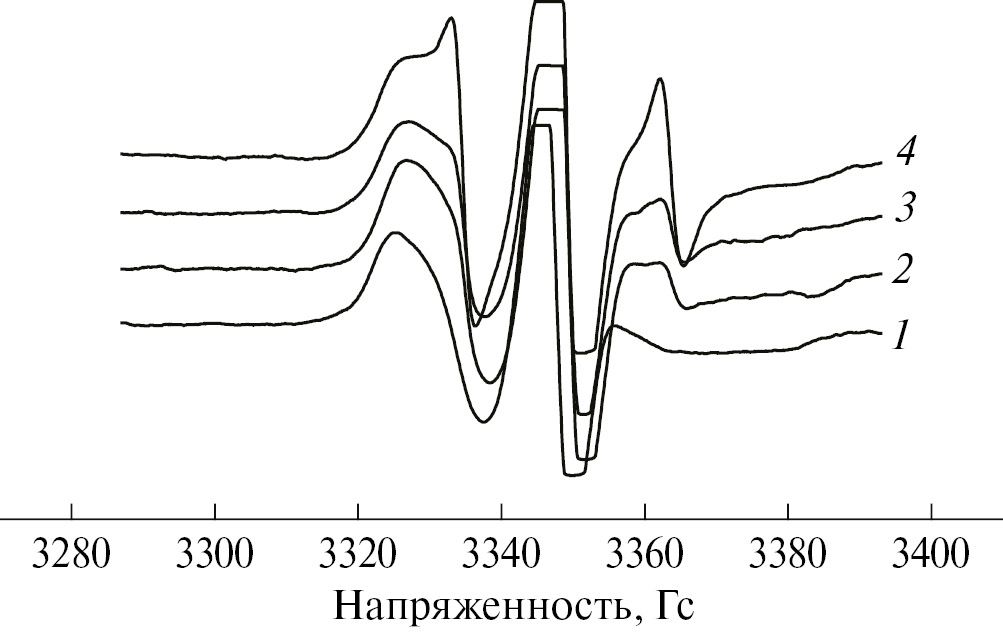 Рис. 2. Спектры ЭПР образцов ПЛА/НК с содержанием НК 0 (1), 5 (2), 10 (3) и 15 (4) мас. %.