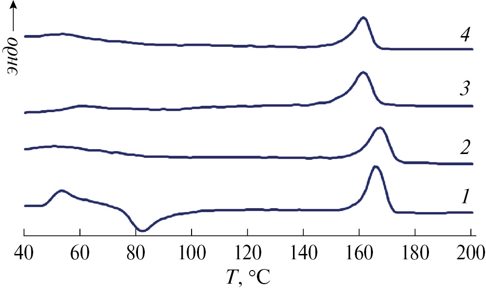 Рис. 3. Термограммы плавления образцов ПЛА/НК с содержанием НК 0 (1), 5 (2), 10 (3) и 15 (4) мас. %.