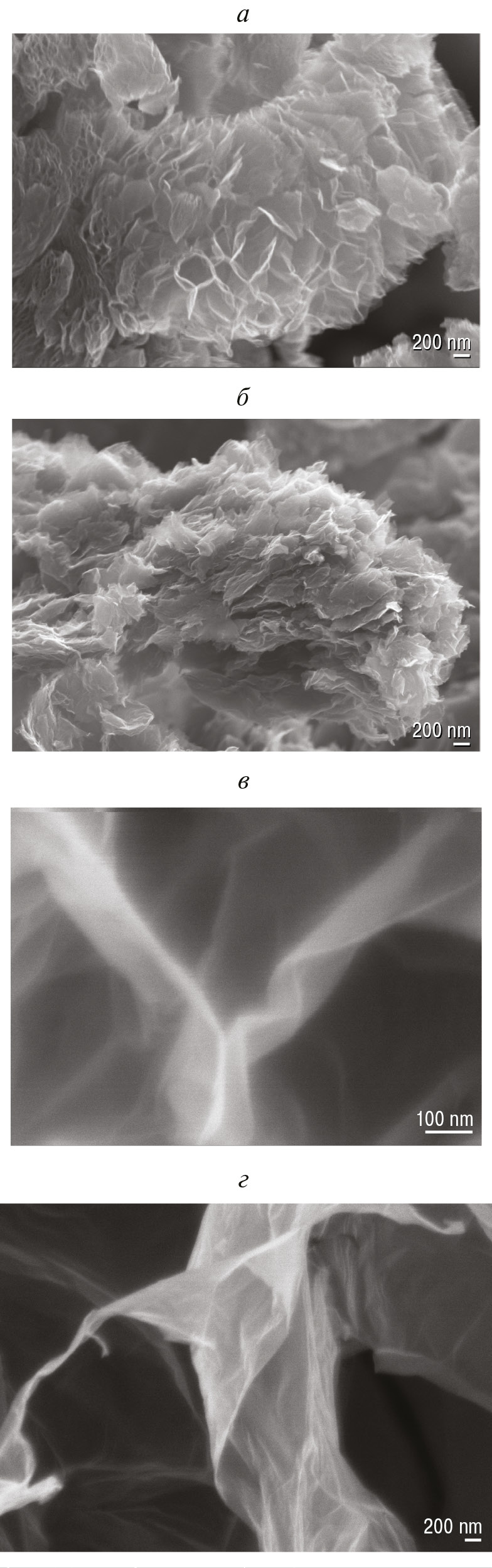 Модифицирование ТРГ в условиях сильного окисления, нагреве со скоростью 3 °С/мин до 350 °С и под действием СВЧ-излучения в течение 20–30 с позволило получить графитовые порошки с лепестками в виде графеновых слоев (рис. 3в, г). На микрофотографиях, полученных на сканирующем электронном микроскопе, изображены участки расщепления слоистой графитовой структуры на графеноподобные лепестки (рис. 3б). Сравнение микрофотографий терморасширенных графитов после слабого (рис. 3а) и сильного (рис. 3б) окисления показывает значительное уменьшение размеров частиц при сильном окислении. Преимущество расщепления графитовых слоев под действием электромагнитного СВЧ-излучения после ослабления связей между слоями за счет модифицирования кислотами связано с уменьшением энергозатрат, большей скоростью объемного расширения окисленных графитов и более глубоким проникновением электромагнитной волны, допускающим более тонкое расщепление графитовых частиц на слои.