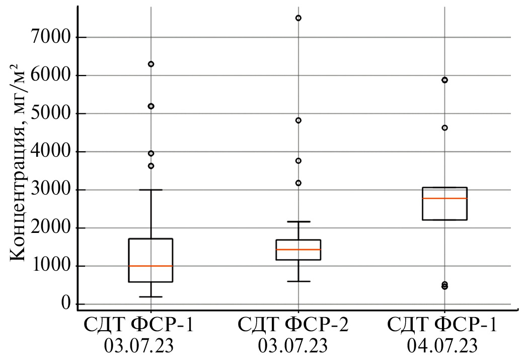 Измерения на Надеждинском металлургическом заводе им. Б.И. Колесникова Заполярного филиала ГМК “Норильский никель” проводились 3 и 4 июля 2023 г. с помощью двух ИК-фурье-спектрометров (ФСР-1 и ФСР-2), основные характеристики которых представлены в табл. 1. В этой серии экспериментов ИК-спектры выбросов регистрировались только на срезе одной ДТ. Термограмма ДТ Надеждинского металлургического завода идентична термограмме ДТ № 1 Медного завода (см. рис. 4а) и отдельно в настоящей работе не приводится. На рис. 8 представлены блочные диаграммы с ограничителями выбросов для значений интегральных концентраций SO₂, полученных на срезе ДТ с помощью ФСР-1 и ФСР-2. В табл. 4 приведены значения медианы интегральных концентраций SO₂, значений 1-го и 3-го квартилей блочных диаграмм распределений для каждой серии измерений и типа ИК-фурье-спектрометра соответственно.