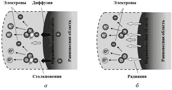 Возникновение электронов перед ударной волной объясняется двумя конкурирующими механизмами: диффузией электронов из послеударной области и фотоионизацией молекул коротковолновым вакуумно-ультрафиолетовым излучением ударно-нагретого газа. Ионизационный процесс за ударной волной инициируется химическими реакциями ассоциативной ионизации. Данный процесс особенно важен в неравновесной зоне ударно-нагретого газа, так как именно он отвечает за формирование радиационных тепловых потоков.