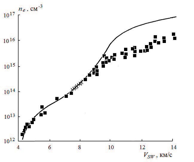 Измерение электронной концентрации пе в квазистационарной области течения за сильными ударными волнами в воздухе проводилось в электроразрядной ударной трубе ADST при начальном давлении p0 = 0.2 Торр и значении скорости ударной волны VSW в интервале от 4.3 до 15 км/с [43]. Так как в рассматриваемых условиях число Кнудсена составляет величину порядка единицы, для обработки данных зондовых измерений использовались результаты работы [44], в которой построена приближенная теория работы зондов в переходном режиме.