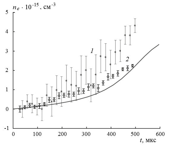 Рис. 5. Временна́я зависимость концентрации электронов в смеси 1% O2 + Ar за отраженной ударной волной при T = 11209 K и p = 0.37 атм, измеренная методами штарковского уширения (1) и штарковского сдвига (2) [58]. Линия – результаты расчета.