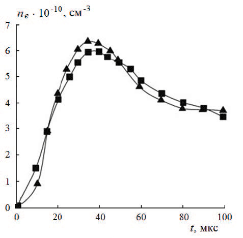 Рис. 8. Сравнение временны́х зависимостей ne, измеренных СВЧ-интерферометром с линиями Лехера (треугольники) и рупорно-линзовой фокусировкой (квадраты) при воспламенении смеси 0.5% СН4 + + 2% O2 + 97.5% Ar за отраженной ударной волной [77].