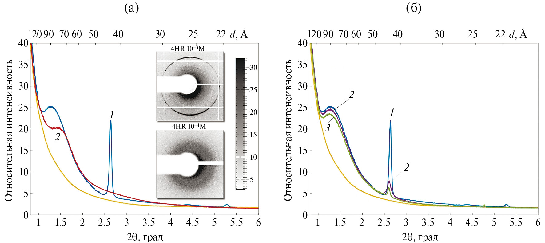 Рис. 1. Зависимость интенсивности рассеяния от угла 2θ образцов, содержащих бактериальные клетки штамма E. coli Gold, подвергнутые воздействию 4HR на стационарной фазе роста в следующих концентрациях: а – 10–4 М, анабиотическое состояние клетки (кривая 1, синяя), 10–3 М – мумифицированное состояние (кривая 2, красная); б – 10–4 М (кривая 1, синяя), 10–5 М (кривая 2, фиолетовая), 10–6 М (кривая 3, зеленая). Тонкие желтые кривые (на этом рисунке и далее) – интенсивность рассеяния от клеток в фазе активного роста. На вставках показаны дифрактограммы анабиотического и мумифицированного состояний клеток.