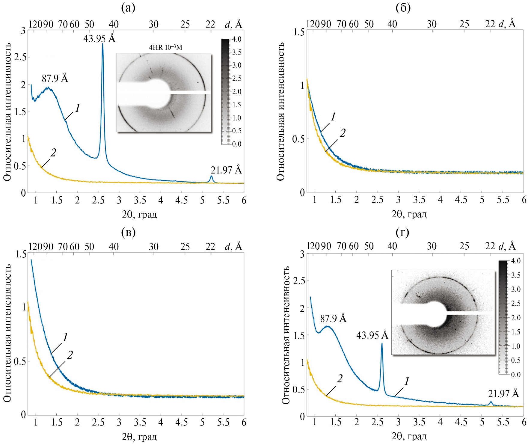 Интенсивность рассеяния от клеток E. coli в стационарной фазе роста, подвергнутых воздействию 4HR в концентрации 10–4 М (кривая 1), по форме идентична кривой, полученной от клеток, находящихся в условиях стресса голодания [9, 10] (см. также ниже рис. 4г). На кривой наблюдаются пики, соответствующие разрешению при 44 и 22 Å, а также широкий пик с максимумом интенсивности при разрешении 88 Å.