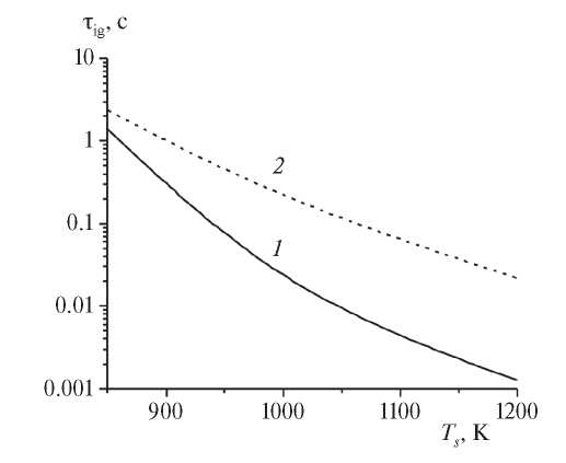 Видно, что добавка пропилена в целом увеличивает время задержки зажигания. По мере увеличения температуры проволоки τig снижается для обоих вариантов, без добавки и с добавкой пропилена, однако влияние добавки усиливается. Так, если при температуре 850 К добавка пропилена увеличивает τig в 1.7 раза, то при температуре τig = 1000 К – в 13 раз, а при 1200 К – в 17.4 раза.