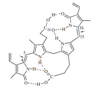 Данные литературы указывают на то, что БР в растворе обладает изогнутой конформацией, имеющей Z-конфигурацию относительно двойных связей 4–5 и 15–16 (4Z, 15Z-изомер, обозначаемый как 4Z, 15Z-билирубин-IXα), стабилизированную внутримолекулярными водород-ными связями (рис. 2). Такую конформацию БР имеет и в комплексе с сывороточным альбумином человека (САЧ) [8, 11, 12].