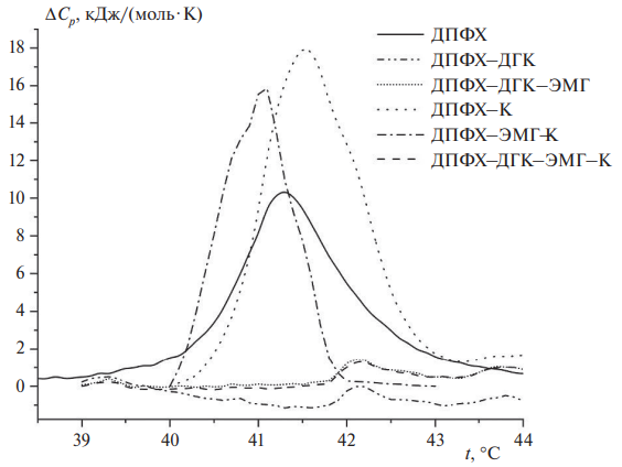 Дополнительная информация о влиянии введения ДГК, ЭМГ и инкапсулирования коньюгатом Каз-Na–МД на структурное состояние бислоя липосом была получена на липосомах модельного дипальмитоилфосфатидилхолина методом дифференциальной сканирующей калориметрии. Из рис. 1 видно, что на термограмме, полученной для липосом ДПФХ, при температуре t = (41.3 ± 0.1) °C наблюдается фазовый переход (ФП) бислоя из гелеподобного фазового состояния в жидкокристаллическое. Этот переход характеризуется величиной энтальпии DНФП = (17.4 ± 1.6) кДж/моль. Инкапсулирование липосом ДПФХ конъюгатом приводило к небольшому сдвигу температуры ФП, (41.5 ± 0.1) °C, и статистически значимому возрастанию энтальпии, (25.2 ± 2.3) кДж/моль. По-видимому, этот результат подтверждает данные ЭПР-спектроскопии, предполагающей встраивание гидрофобных участков белка в бислой липосом ДПФХ. При этом увеличение DНФП могло свидетельствовать как о формировании новых гидрофобных связей между гидрофобными функциональными группами белка и углеводородными цепочками жирных кислот в бислое ДПФХ, так и о возрастании энергии гидрофобного притяжения между углеводородными цепочками жирных кислот ДПФХ, формирующих бислой.
