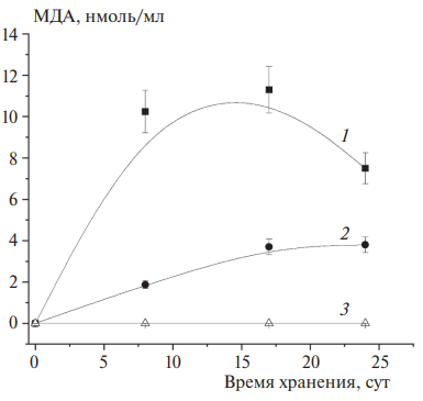 Рис. 2. Накопление вторичного продукта перекисного окисления ПНЖК (МДА) в водных растворах липосом ФХ-ДГК (1), ФХ-ДГК-ЭМГ (2) и супрамолекулярного комплекса ФХ-ДГК-ЭМГ-К (3) при их хранении в течение 24 сут при комнатной температуре (20–22 оС) на свету (рН = 7.0, I = 0.001 М).