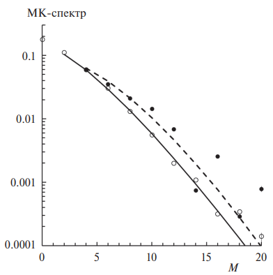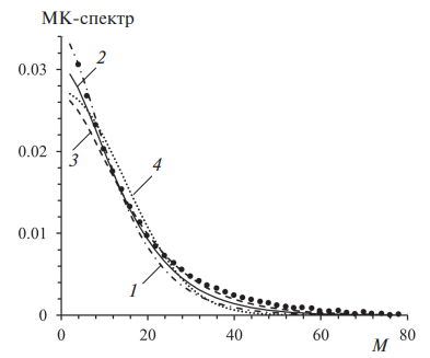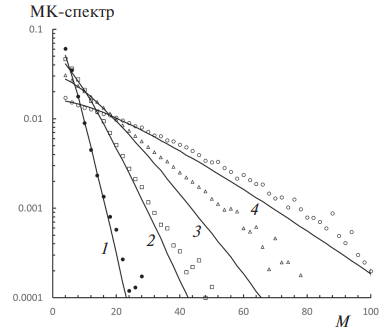 Необходимо подчеркнуть, что задаваемая выражением (19) форма спектра заметно отличается от гауссовской, хотя соотношение среднего размера кластера со вторым моментом спектра <M 2> осталось таким же, как у функции Гаусса. Полученная экспоненциальная зависимость спектра от М линейна в отличие от квадратичной гауссовской зависимости М 2. Кроме того, найденный спектр спадает в е раз при величине тогда как для гауссовской функции падение в е раз происходит при значении . Это свойство было ранее обнаружено нами в работе [52] у рассчитанных по формуле (13) суммарных спектров. Пример сопоставления гауссовского спектра со спектром из соотношения (19) и экспериментальным МК-спектром, взятым из работы [53], при эквивалентном наборе параметров приведен на рис. 1.