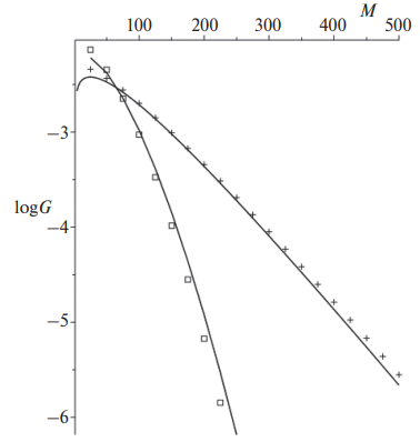 При переходе от суммы (13) к интегралу (19) мы сохранили функцию Гаусса при малых значениях К. Хотя в этом и нет особого физического смысла, это дает математические преимущества при распространении начала интегрирования до значения К = 0. Действительно, на интервале (0,М) подынтегральная функция монотонно растет с увеличением К, поэтому для величины интеграла по этому интервалу имеем оценку сверху: exp(-M/r - M)M 3/2. При больших М этот вклад экспоненциально мал по сравнению с основным вкладом (19). Отметим, что к тому же результату (19) приводит и метод перевала (см. в приложении формулу (А14) при KM = (M 2r)1/2, N1 = 1, C = 0). Выполненное нами сравнение МК-спектров, полученных суммированием (через численное интегрирование) в выражении (13) и рассчитанных по формуле (19), продемонстрировало полное согласие. При Т = 8 и при Т = 9 для обеспечения необходимой точности суммирование пришлось проводить до значений К = 1 000 000.
