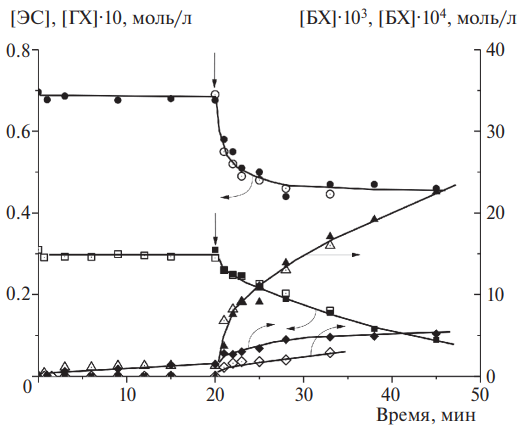 Упрощенность этой схемы первого приближения очевидна. Отсутствие детализации связано с вынужденным игнорированием факта быстрой дезактивации катализатора в ходе реакции. С дезактивацией связано уменьшение в ходе опытов величин Δ[ЭС]/Δ[ГХ] и ν – числа каталитических циклов (табл. 1). По поводу дезактивации возможен ряд вопросов, в частности: каков механизм дезактивации? Как в ее ходе изменяются свойства катализатора и его способность регулировать состав оксидата? Ответов на эти вопросы, с учетом сложности системы, нет.
