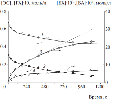 На рис. 1 и 2 представлены примеры кинетических кривых превращения тройной системы ЭС – ГХ – CuCl2 (рис. 1) и ее окисления молекулярным кислородом (рис. 2); недостающие третьи компоненты введены по ходу опытов в соответствующие двойные системы. Данные рис. 1 и 2 ясно показывают, что исследуемая ТрС – типичная синергистическая система, для скоростей окисления и брутто-превращения которой выполняется условие VТрС >> VГХ – CuCl2 + VЭС – CuCl2 + VЭС – ГХ, т.е. скорости в тройной системе превышают суммы скоростей реакций возможных двойных систем. На рис. 3 представлены кинетические кривые расходования ЭС и ГХ и накопления продуктов БХ и БА. Рисунок 3 иллюстрирует сложность кинетики превращения ТрС, а в табл. 1 эта сложность проиллюстрирована количественно: в ходе опыта (время опыта разбито на отрезки Δt = 3 мин) уменьшается в пять раз отношение количеств израсходовавшегося эпоксида и гидрохинона. Кроме того, за время опыта в ~15 раз снижается активность медного катализатора, рассчитанная как число каталитических циклов ν = = Δ[ЭС]/[CuCl2]. Близкό к единице, отношение количеств израсходовавшегося гидрохинона и накопившегося продукта его превращения бензохинона, которое возрастает к концу опыта.