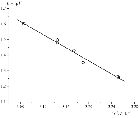 Рис. 6. К определению энергии активации окисления тройной системы ЭС – ГХ – CuCl2; аррениусовская зависимость lgV от 103/T; [ЭС]0 = 0.69, [ГХ]0 = 0.031, [CuCl2] = 9.3∙10-4 моль/л, растворитель – метанол.
