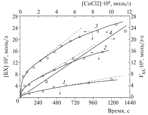 Рис. 7. Кинетические кривые 1–3 накопления бензохинона при – [CuCl2] = (2.9 ∙ 10-4, 5.8 ∙ 10-4, 11.5 ∙ 10-4 моль/л соответственно; зависимость начальных скоростей накопления БХ, рассчитанных по тангенсам углов наклона штриховых кривых 1–3 от [CuCl2] (4). Барботаж кислородом, [ЭС]0 = 0,69, [ГХ]0 = 0,031, растворитель – метанол, 318 K.