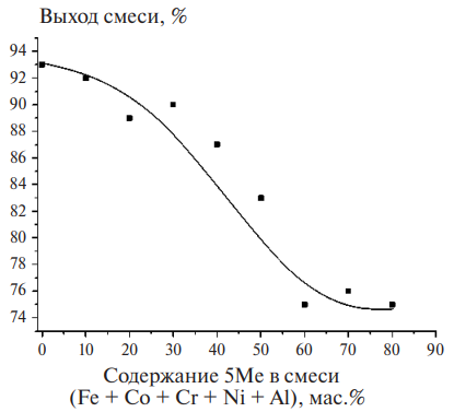 Часть порошка налипает (наклепывается) на стенки барабанов активатора и поверхность шаров в процессе МА [13, 20]. За выход смеси после активации примем отношение массы неналипшей активированной смеси, которую можно легко извлечь после МА из барабана, к массе исходной порошковой смеси, закладываемой в барабан перед МА. Добавление в активируемую смесь металлической связки 5Ме, в которой присутствуют пластичные металлы, увеличивает налипание порошка в процессе МА на стенки барабанов и поверхность шаров. В результате с увеличением содержания металлической связки уменьшается выход смеси после МА (рис. 2).