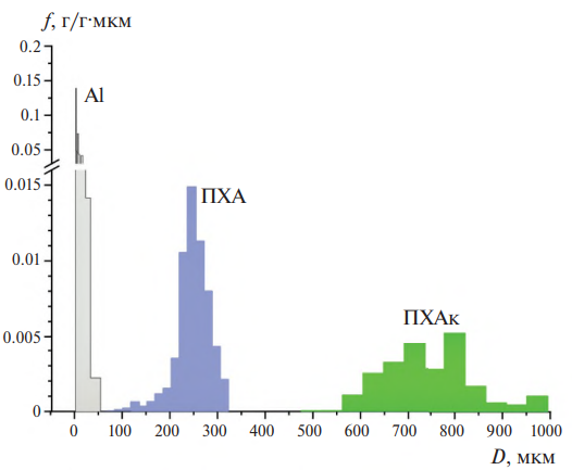 Рис. 1. Массовые функции распределения частиц алюминия, среднего и крупного перхлората аммония по размерам.