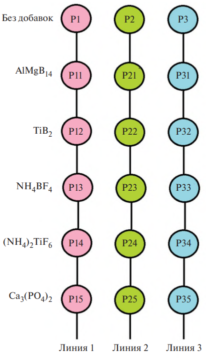 Схема вариации составов топлив представлена на рис. 2. Имеются базовые топлива Р1, Р2 и Р3. Топливо Р1 содержит 20% связующего, 20% Al и 60% ПХАк. Топливо Р2 отличается размером частиц окислителя и содержит 20% связующего, 20% Al и 60% ПХА. Топливо Р3 имеет пониженное содержание Al (18%), повышенное содержание ПХА (62%) и то же количество связующего (20%). Следуя данным работы [51], каждую добавку-модификатор вводили в базовое топливо в количестве около 2% (сверх 100%). Добавки: диборид титана TiB2, борид алюминия и магния AlMgB14, аммоний-титан(IV) фтористый (NH4)2TiF6, тетрафтороборат аммония NH4BF4, кальций фосфорнокислый 3-замещенный Ca3(PO4)2. Выбор добавок обусловлен наличием атомов “горючих” Al, Mg, B, Ti или атома F как окислителя и одновременно элемента, способного взаимодействовать с оксидной пленкой, покрывающей частицы алюминия. Соединение Ca3(PO4)2 – условно инертное – использовано для сравнения. В дальнейшем будем говорить о трех “линиях” рецептур, получаемых из базовых топлив Р1, Р2 и Р3 путем введения перечисленных добавок (рис. 2). Составы модельных топлив представлены в табл. 2.