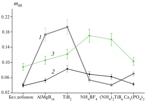 Масса агломератов характеризуется безразмерным параметром m80 (см. рис. 6). Из этого рисунка можно видеть, что для топлив линий 1, 2 и 3 все исследованные добавки приводят к увеличению массы агломератов m80, за исключением добавки (NH4)2TiF6 для топлива линии 1.