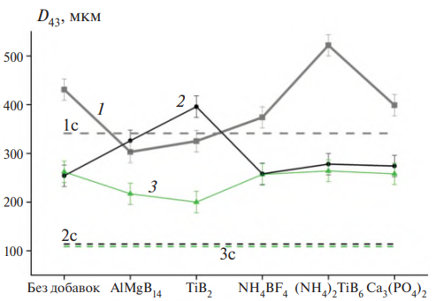 В табл. 4 приведены средние размеры агломератов Dmn. На рис. 7 показано влияние добавок на средний размер агломератов D43. В разных линиях топлив это влияние неоднозначно. Отметим случаи желаемого эффекта – снижения среднего размера D43. Для топлив линии 1 добавки AlMgB14 и TiB2 приводят к заметному снижению D43, добавки NH4BF4 и Ca3(PO4)2 – к незначительному снижению. Для топлив линии 2 ни одна добавка не дала желаемого эффекта. Для топлив линии 3 добавки AlMgB14 и TiB2 приводят к снижению D43.