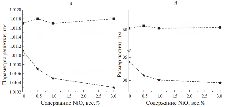 Рис. 1. Зависимость параметра решетки (а) и размера частиц (б) In2O3 от содержания NiO в композитах, полученных методом импегнирования (квадраты) и гидротермальным методом (звездочки).