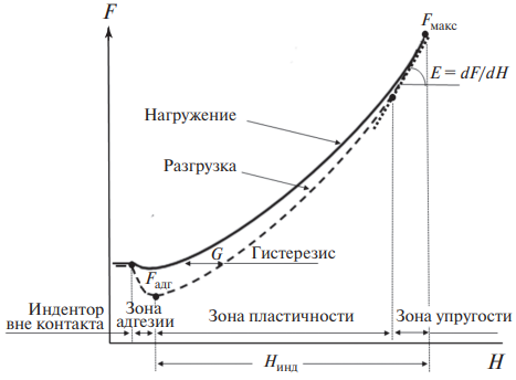 Кривая нагружения отражает работу, затраченную на преодоление сопротивления материала, определяемого его жесткостью (твердостью) при вдавливании индентора. Обратный процесс разгружения есть работа, затрачиваемая на восстановление материала. Во многих случаях деформирование происходит с развитием пластичности, когда восстановление проходит не упруго, а с запаздыванием из-за наличия в материале различных по вязкости структурных элементов. Это приводит к потере (диссипации) энергии в течение цикла разгружения и выражается на СК как разница между кривыми нагружения и разгружения, или гистерезис. Поэтому для расчета модуля упругости (E) анализируют только верхний прямолинейный участок разгрузочной кривой по тангенсу его наклона, где материал упруго откликается в ответ на приложенную силу (Fмакс), а влияние сил адгезии минимально и гистерезис еще не проявляется.