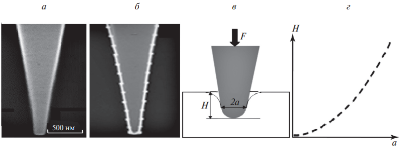 Рис. 4. Оценка геометрических размеров зонда с помощью метода кусочно-линейной интерполяции: а – СЭМ-микрофотография параболического зонда; б – профиль зонда, представленный через набор прямолинейных сегментов; в – схема вдавливания зонда в поверхность образца; г – график функции H(a), определяющей радиус контакта зонда с гипотетическим образцом при любой текущей глубине индентирования.